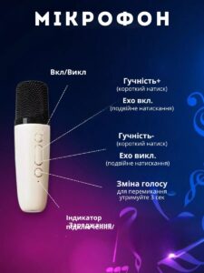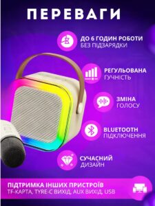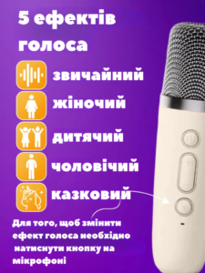 Міні-колонка і мікрофон для караоке ідеально підходить для дітей різного віку. Світлодіодні ліхтарі на стовпчику створюють веселу атмосферу. Режими підсвічування можна змінювати. Завдяки роз’єму для виходу навушників він ідеально підходить для занять співом чи сімейних вечорів караоке.